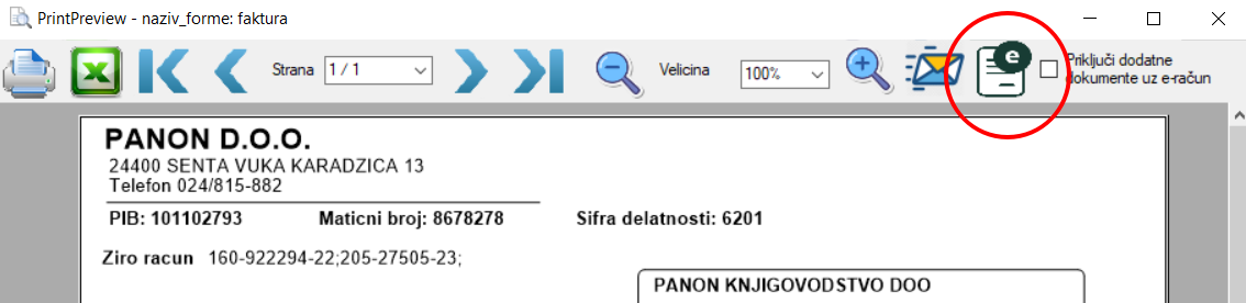 Slanje e-faktura se vrši klikom na ikonu e-fakture na formi za štampu.