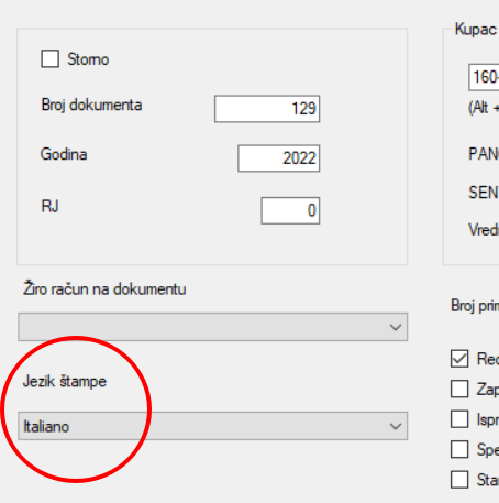 Svi štampani dokumenti su potpuno prilagodljivi. Svaka stranica koju štampate poseduje šablon koji možete menjati po vašem nahođenju. Možete dodati vaš memorandum ili sliku po želji, možete premeštati elemente štampe i potpuno izmeniti izgled štampanog dokumenta. Na svaki računa, otpremnmicu, avansni račun i predračun možete dodati prateći tekst po želji kao i izmeniti jezik štampe dokumenata.